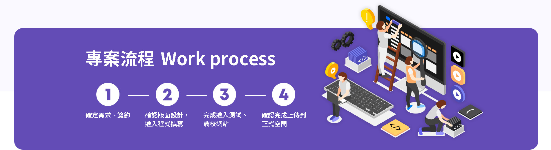 我們成於民國100年,專為企業提供品牌視覺设计、站架設、程式建置、網路行銷等服務。致力為各大企業提供互連網相訊解决方案並集结各領域的專業围隊,為企業打造多元化的加值服務。